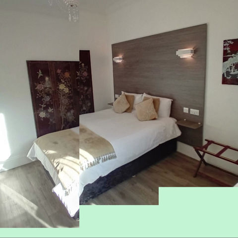Grosvenor House Front room provides guests with spacious king sized comfort, en-suite bathroom and walk in wardrobe.It has stained glass windows, so we provide eye masks for guests who stay in this room.